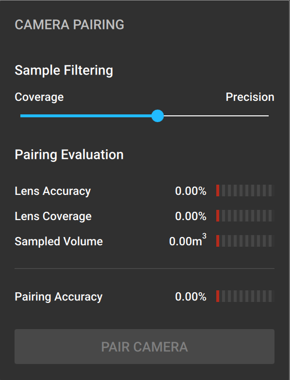 Sample Filtering: impacts the error metrics.\ It allows you to specify coverage of the frame versus precision of the points in your samples. In a way, it gives you the chance to filter out points that are not as accurate. This can be useful if you have many samples and would like to remove points that are not successful. In this case, you would shift the slider towards precision so it can filter out less precise point on the calibration chart. In contrast, if you have only a few samples, you might shift the slider towards coverage to improve your metrics.\ Please note that you should wait to shift this slider until you have clicked Pair Camera, so see the final Pairing Accuracy before correcting it.