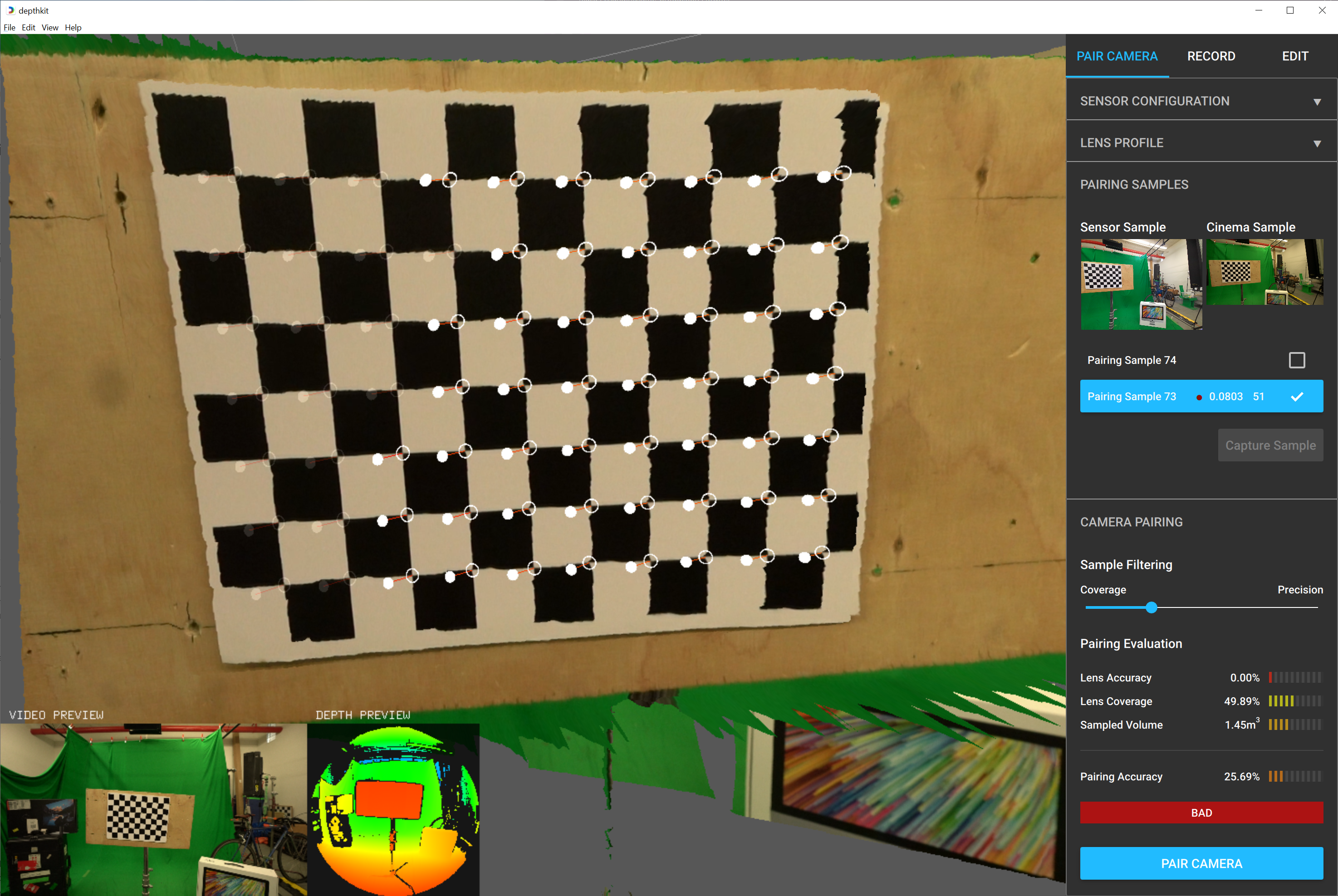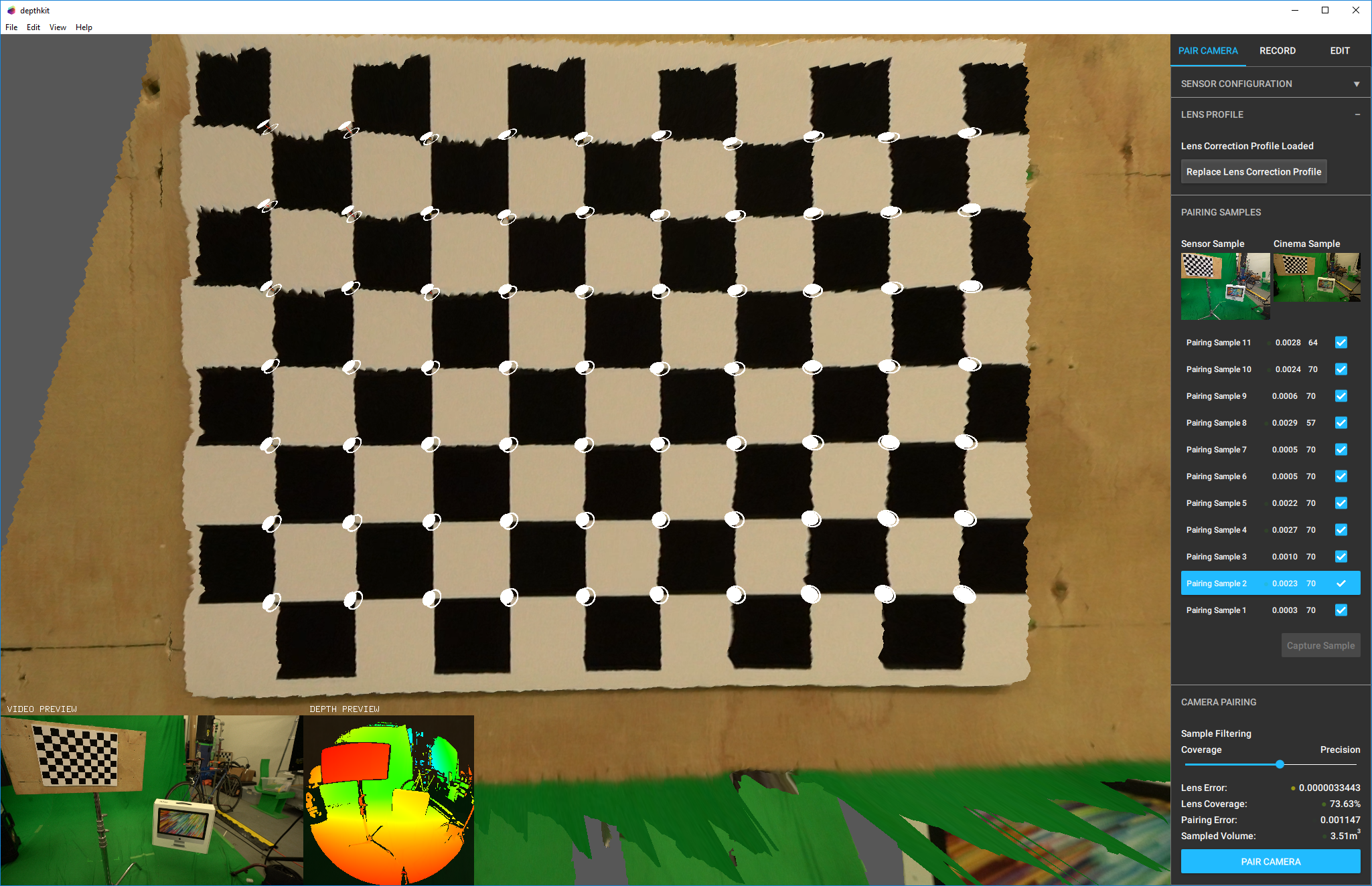 Once you have captured a series of both sensor and cinema samples filling the 2D frame and 3D z-space, you are ready to pair the camera and depth sensor in Depthkit.