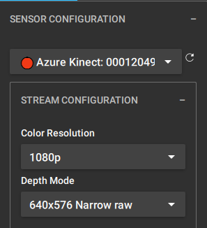 Make sure your desired sensor is selected in the Sensor Configuration panel under Sensor. For this walk through, we are going to pair the Azure Kinect to our camera. Please note that sensor configuration settings will vary per sensor.