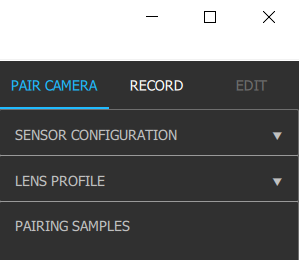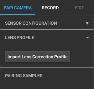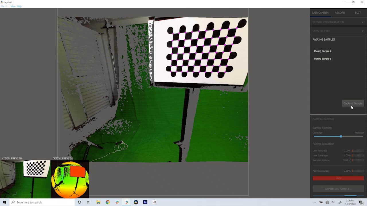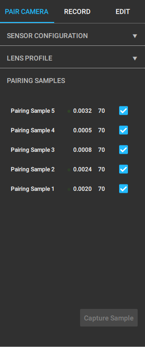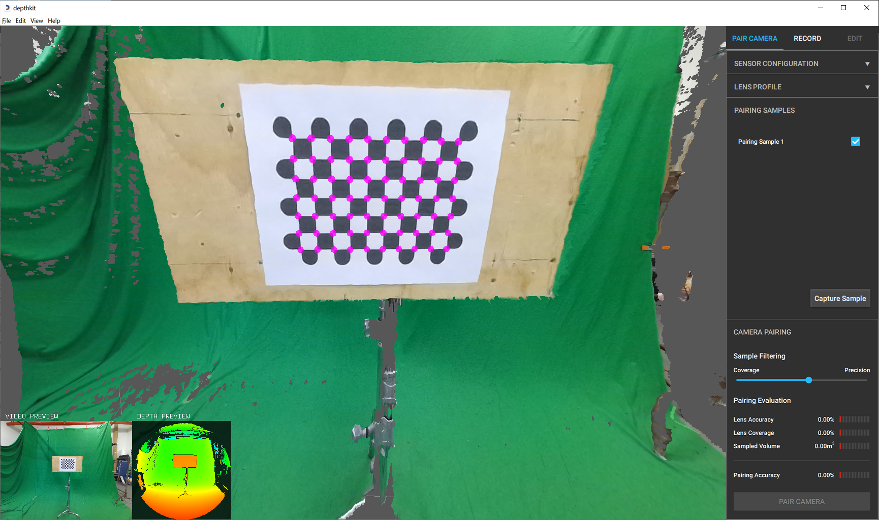 Once the lens correction profile is loaded, you are ready to record pairing samples from both the camera and the depth sensor. These are short video recordings of the calibration chart located at various sections of the frame and z-space.