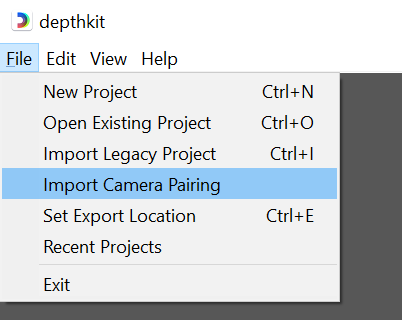 To import a Camera Pairing, go to the Depthkit menu under File and select Import Camera Pairing.