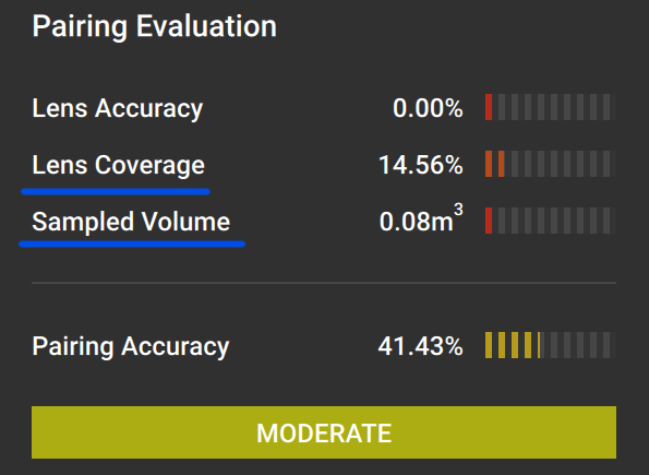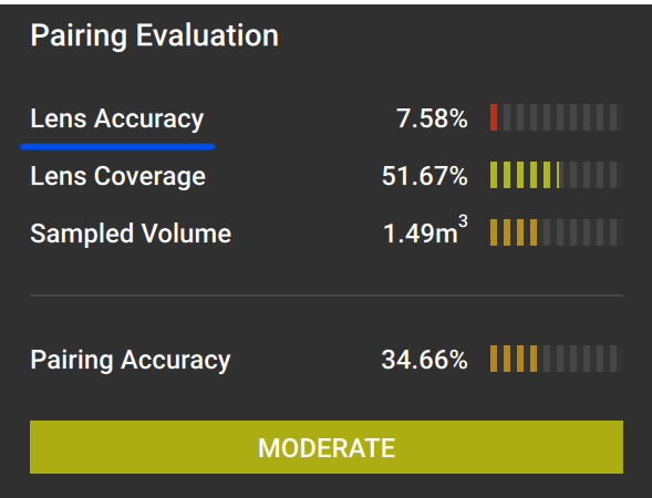 If you have a moderate or bad Pairing Accuracy, you will need to go back and take more samples or replace your lens correction profile to improve your pairing.