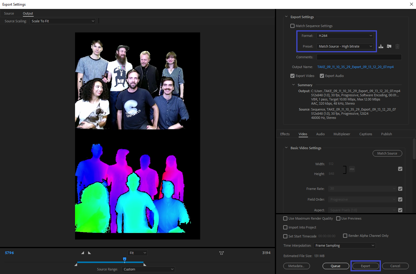 - Export the all or part of the timeline, again preserving the same resolution and framerate as the Depthkit combined-per-pixel video. Reducing the bitrate too much can impact the quality of the asset in Unity, so keep this setting above 5Mbps.