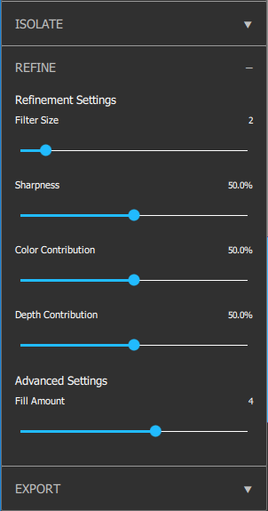 Fill Amount: Complements the Filter Size by providing a secondary fill value. Leave at the default value of 4 unless you are dealing with holes or abrupt clipping in your depth. Decrease the value to remove these artifacts. For Maskless Refinement, keep this value low.