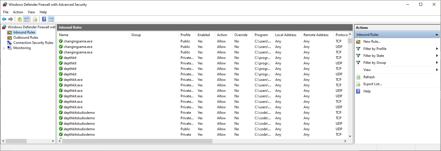- You can also try disabling Windows Defender Firewall (see below) in case the network is blocking the request. In some cases, you may find conflicting rules in Windows Defender Firewall > Advanced Settings - Delete the blocking rules to allow Depthkit to receive messages through your firewall.