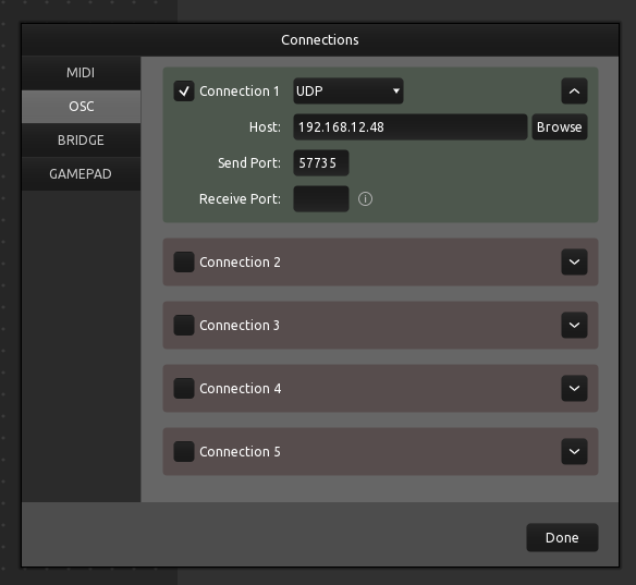 Open Sound Control (OSC) is a widely-used protocol which sends messages in the form of UDP packets to networked devices. This allows you to control certain functionality in Depthkit from remote devices on the same network, such as a smartphone using an OSC client like the TouchOSC app.