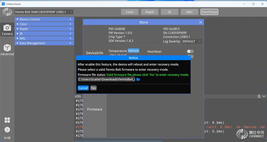 - A popup will appear prompting you to select a valid firmware directory. Select the location of the unzipped firmware - This folder is the root folder of the unzipped archive (e.g. "FemtoBolt_v1.0.9_20231109152127_968a209"), and click "Yes".