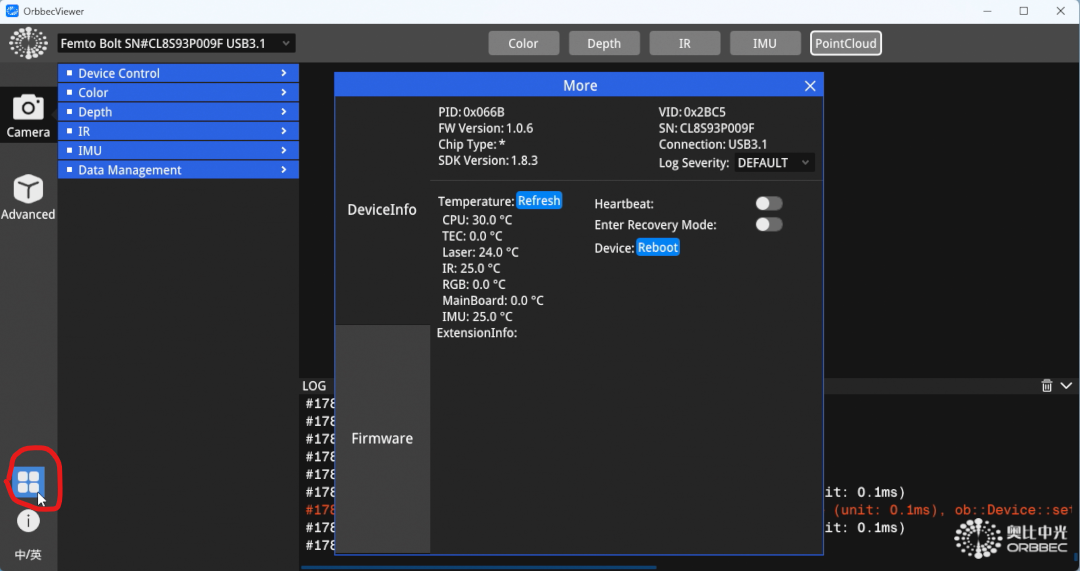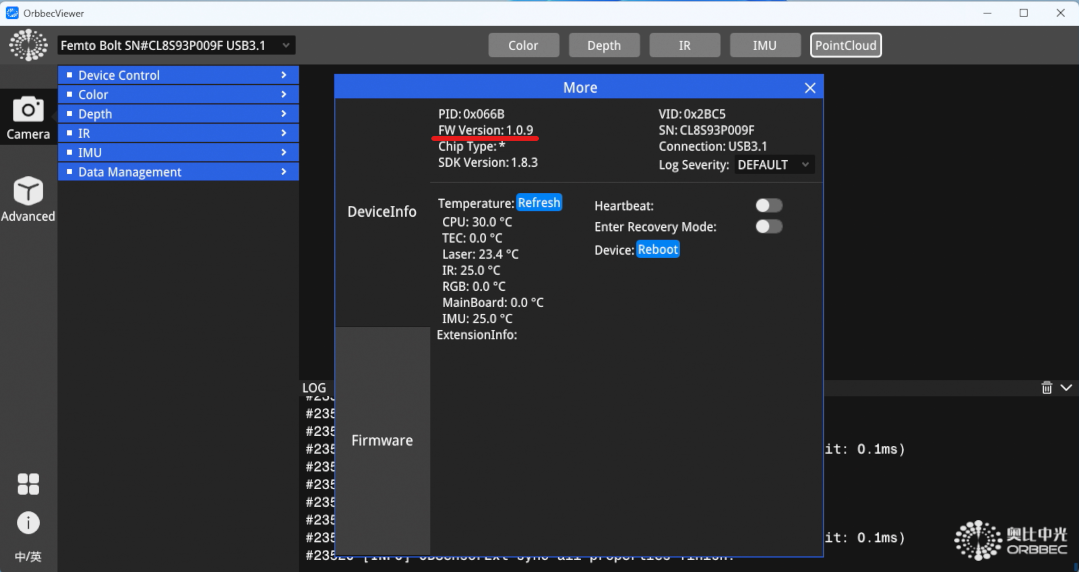 - Once the firmware is finished updating, the sensor will reconnect to Orbbec Viewer. Click the More button to confirm the new firmware version installed on the sensor.