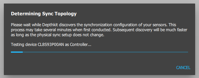 Click 'START STREAMING' to have Depthkit confirm the sync configuration of the sensors automatically. This may take a minute or two the first time you start streaming, as Depthkit needs to try different configurations to discover which sensor is the Primary sensor, but once it is determined, the configuration is saved in the Depthkit project for faster startup of the sensors.