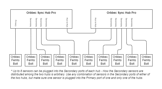 This configuration uses one of your sensors as the generator, which provides a sync reference signal to each of the other sensors via the Orbbec Sync Hub Pro.