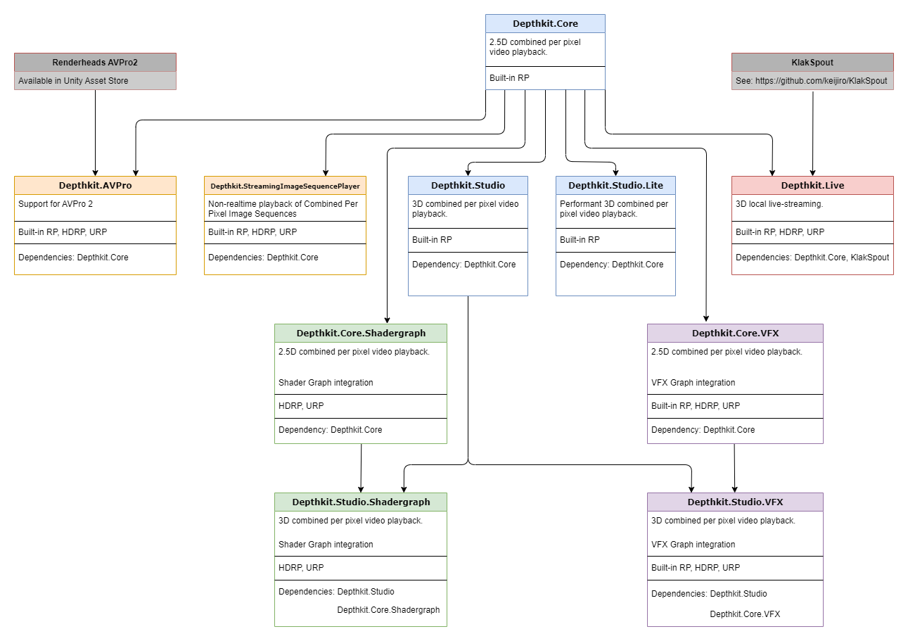 The Depthkit Studio VFX package unlocks Depthkitβs support for the Visual Effect Graph. This package is compatible with Unityβs Scriptable Render Pipelines, including URP and HDRP. Import this package via the Package Manager after importing the Depthkit Core package and Depthkit Studio package.