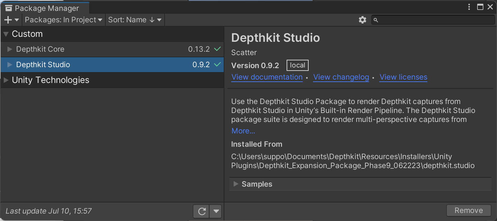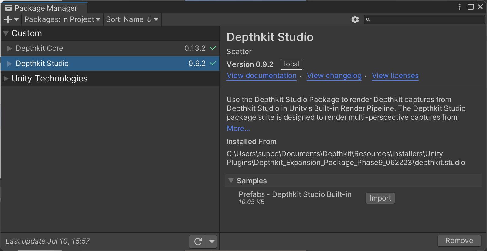 5. You will now see Depthkit Studio populated in your **Package Manager**. Select this item and expand **Sample**. Import the Depthkit Studio Built-in RP prefab.