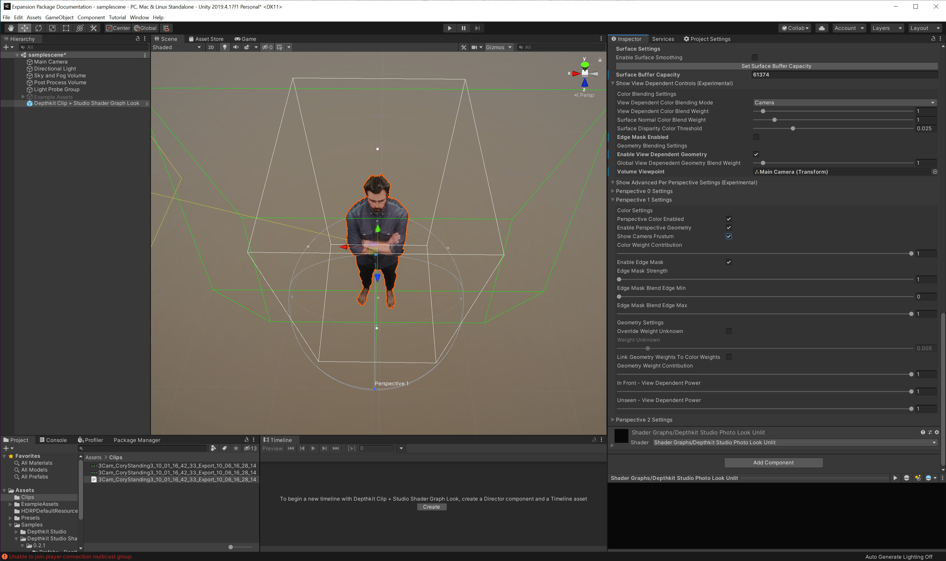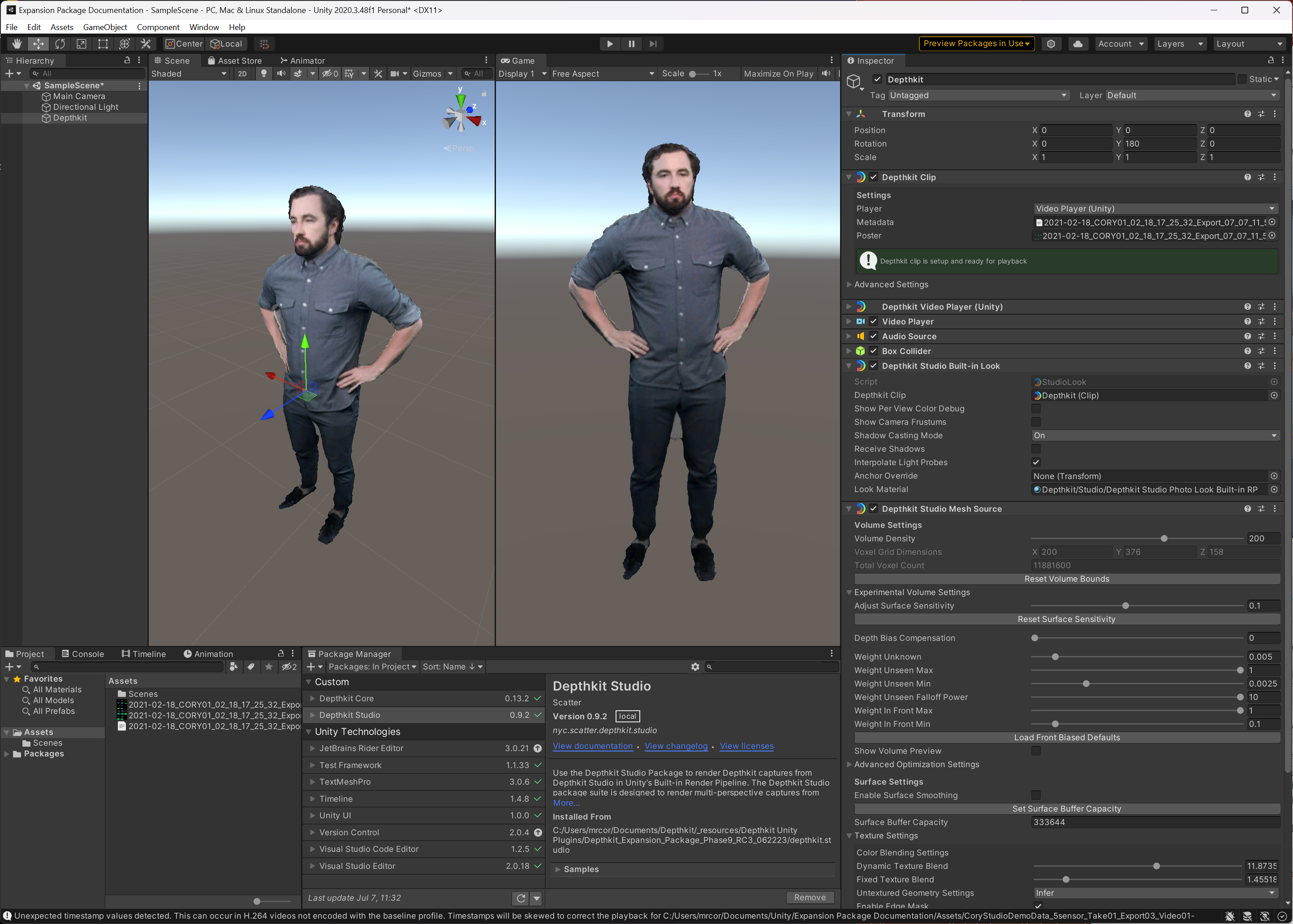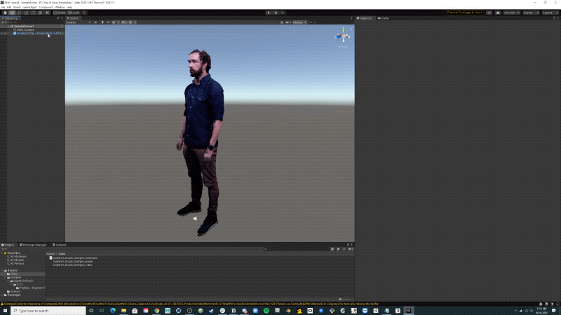 This guide includes how to import and work with the Depthkit Studio Expansion package for Unity. It also includes how to create Depthkit clips in your scene.