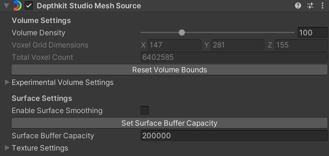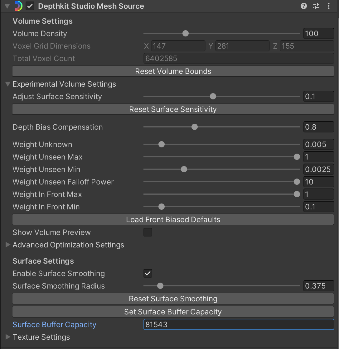 Once your Depthkit clip is positioned in your scene, there are a several handy settings that will significantly improve the quality and performance of your clip. These settings are located in the **Depthkit Studio Mesh Source** component.