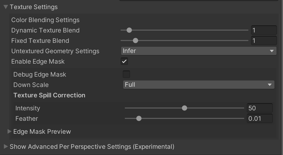Debug Edge Mask - Textures the mesh with a color-coded visualization of the mask generated per perspective for precise edge masking adjustments.