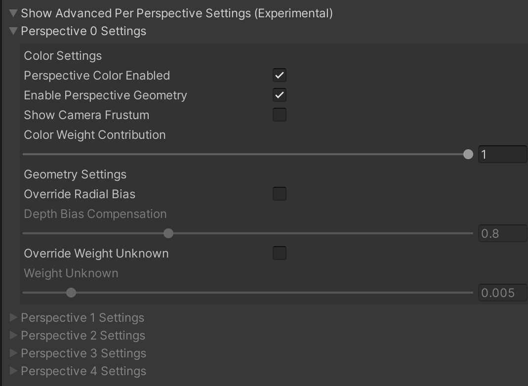 Color Weight Contribution. The percentage that the global view dependent color weight affects this single sensor perspective. Setting this value to 0 will effectively turn off the view dependent contribution for this perspective.