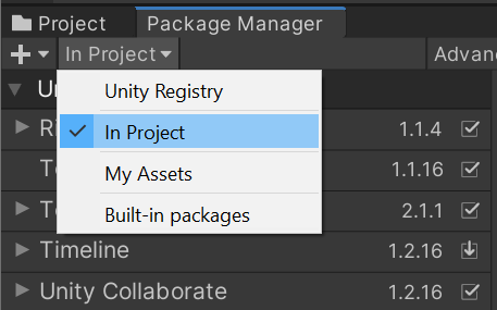 1. Go to the **Package Manager** and select **In Project** in the packages dropdown menu.