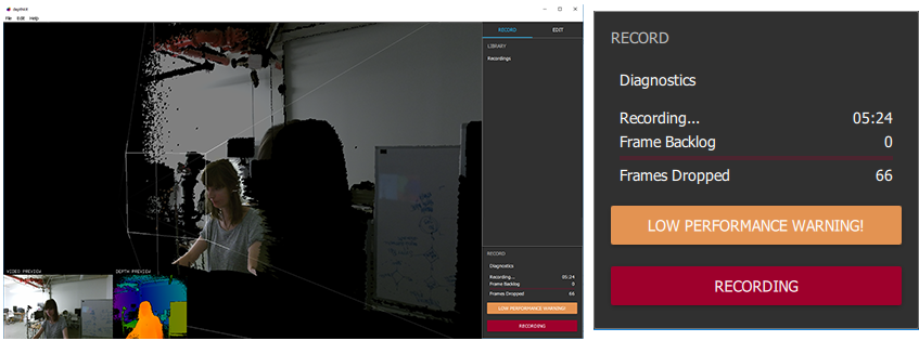 ** Make sure Depthkit is the active window while recording.**\ If you hit Record and then click onto another application window, this might drop more frames. For best results, keep Depthkit active as your primary selected window while you are recording.