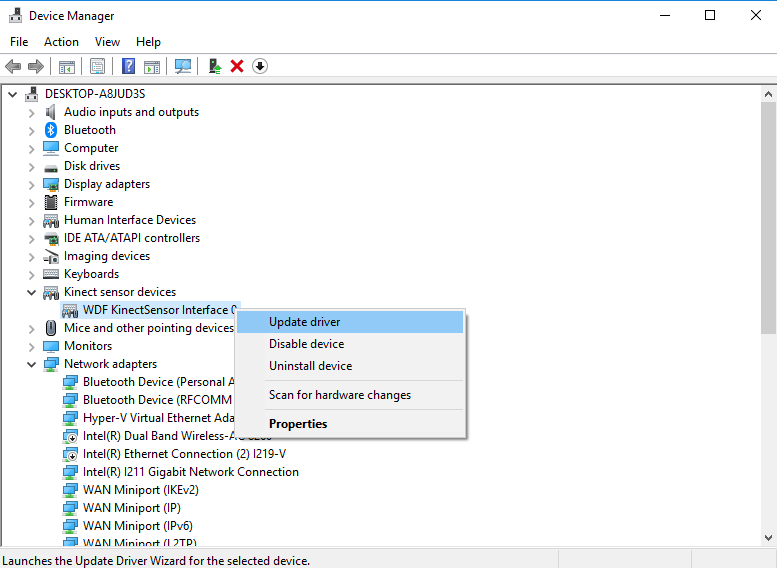 First, update your WDF Kinect Sensor Interface driver. You can find this in the Device Manager, under Kinect sensor devices. In the drop down, right-click on WDF KinectSensor Interface and select update driver.