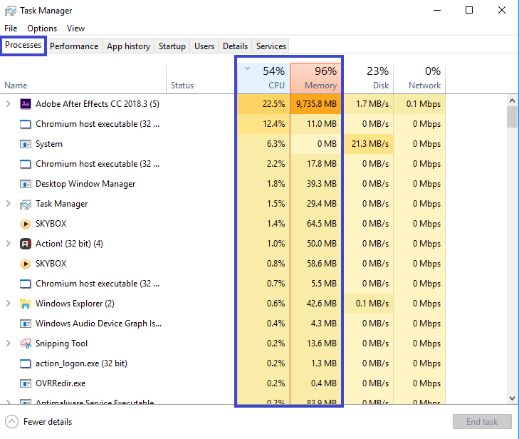 You can identify which applications are using up your performance in the Processes tab of the Task Manager. Click on CPU to view the allocation of CPU usage and what programs need to be closed to help performance.