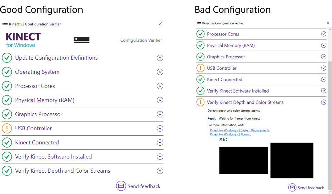 ** Install the Kinect Configuration Verifier Tool. ** Plug in the Kinect to your computer and open the Kinect Verifier Tool. Ideally, all sections should be checked green for best performance, with the exception of the USB Controller (you can disregard the yellow warning). If the Verifier indicates a warning, follow the steps below.